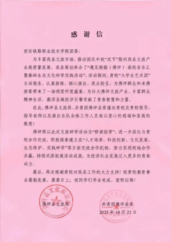 近日,学院收到了来自佛坪县文旅局、共青团佛坪县委的感谢信。信中,佛坪县对我院大学生艺术团在国庆期间参与当地“‘萸’见熊猫”·高校音乐汇活动中的精彩表现和大力支持表示衷心感谢,并对校地合作的丰硕成果给予高度评价。