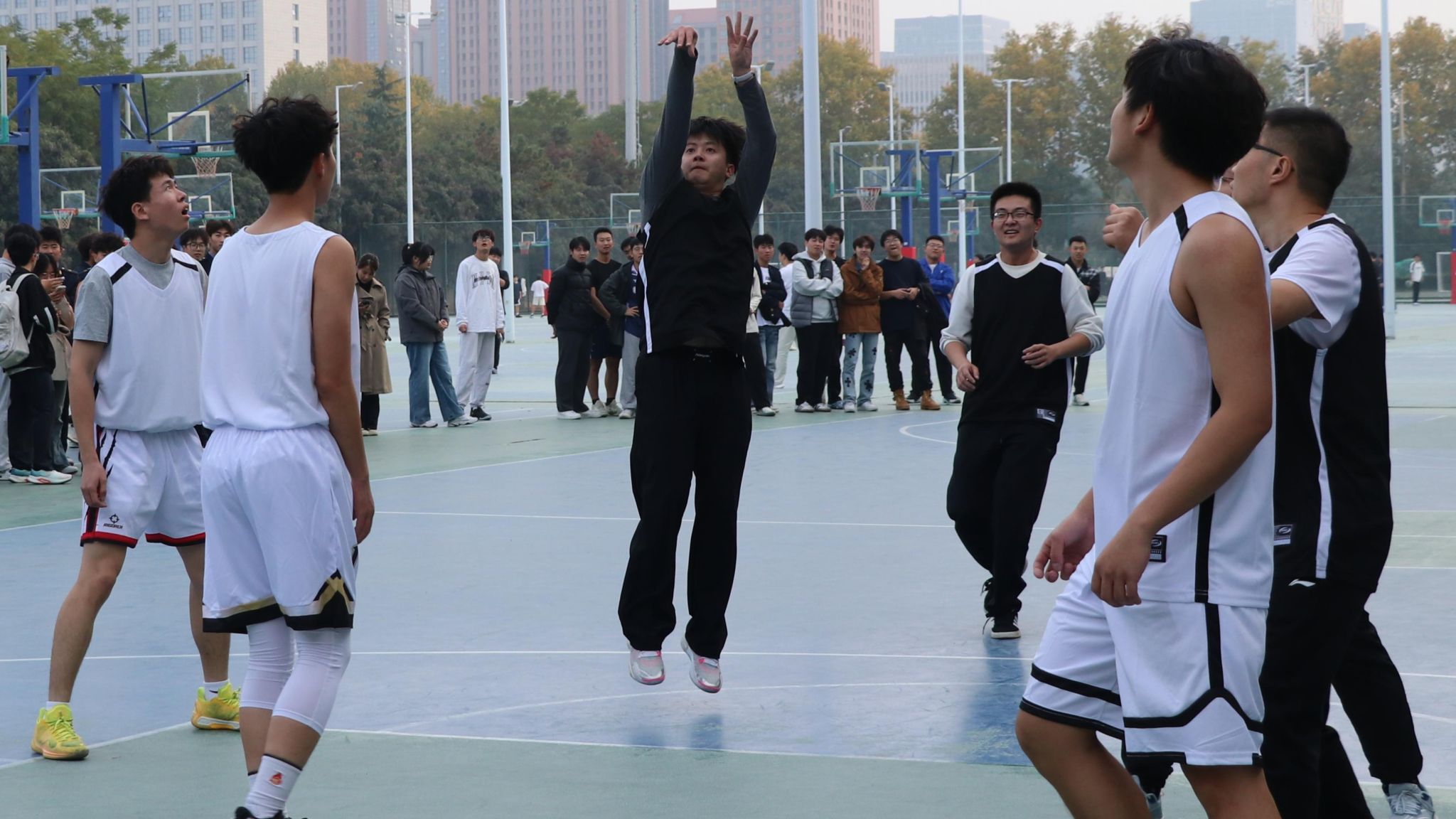 宣誓仪式结束后,师生篮球比赛拉开阳光体育活动的序幕。随着裁判哨声响起,教师队与学生队迅速进入状态,赛场之上,双方队员默契配合、攻防交错。每一个精彩瞬间都引来同学们的阵阵欢呼,场边加油声、呐喊声此起彼伏。比分交替上升的竞技过程中,师生间的距离悄然拉近,篮球不仅传递着力量与技巧,更架起了一座跨越身份的沟通桥梁,让协同拼搏的精神在赛场之上熠熠生辉。