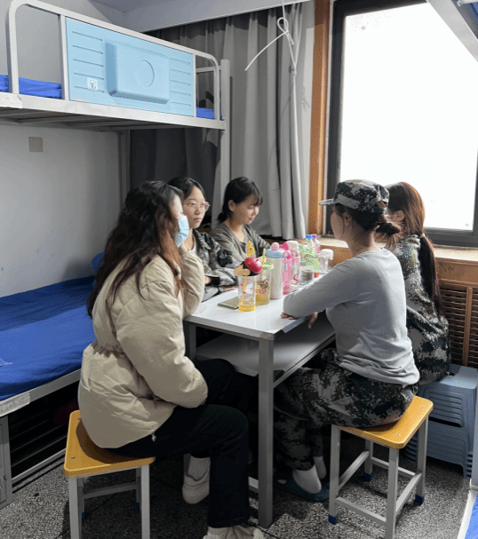 午休时间,军训值班班主任老师走进学生宿舍,以“零距离”方式与学生沟通。老师们坐在学生床沿,查看学生叠放整齐的军训服,围绕军训适应情况、饮食住宿体验、室友相处状态及大学规划方向等话题,与学生展开深入交流,耐心倾听学生诉求并解答疑问。这种贴近学生生活的沟通方式,有效缓解了学生初入校园的陌生感与军训压力,让学生切实感受到学院大家庭的关怀。