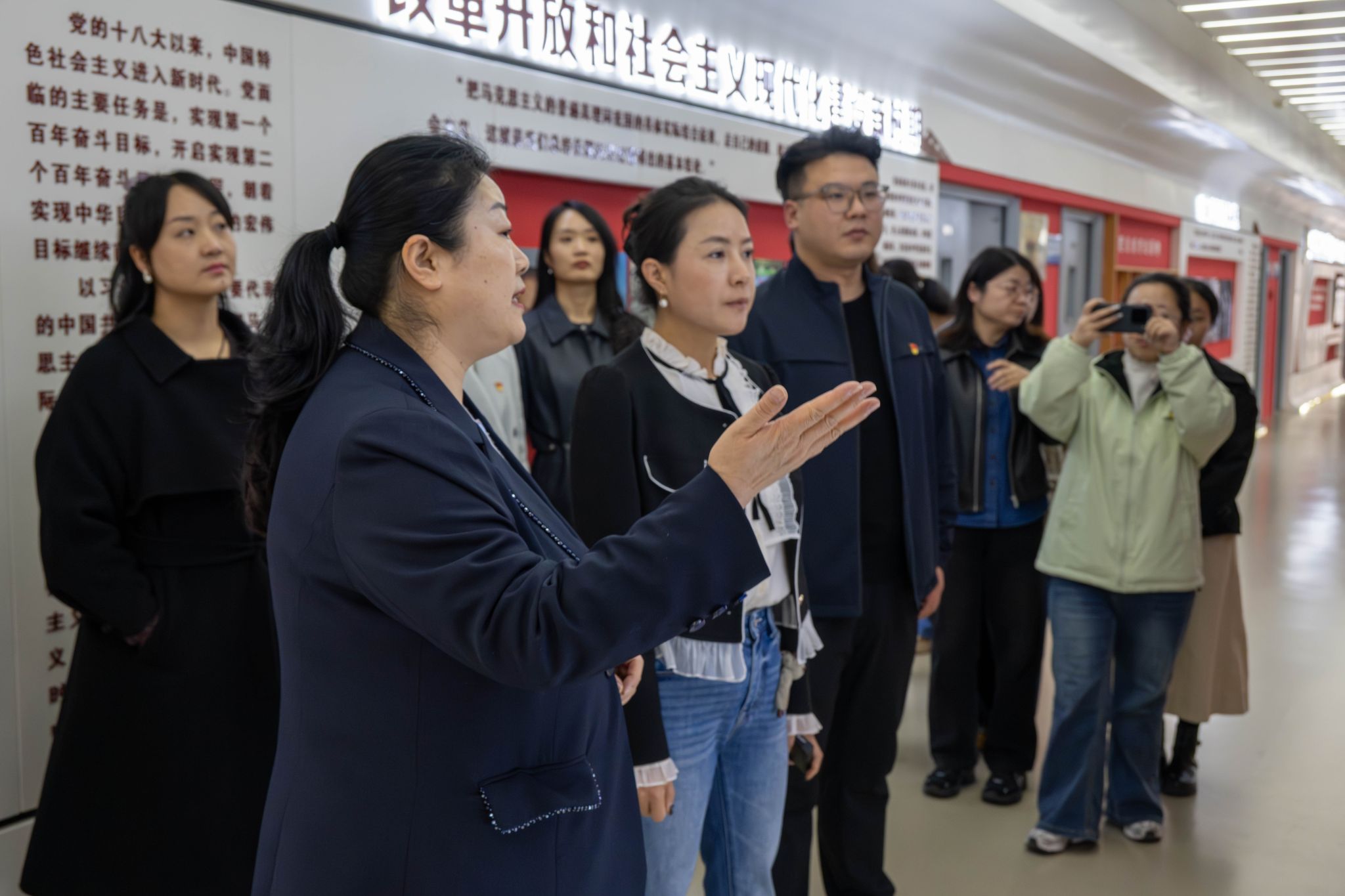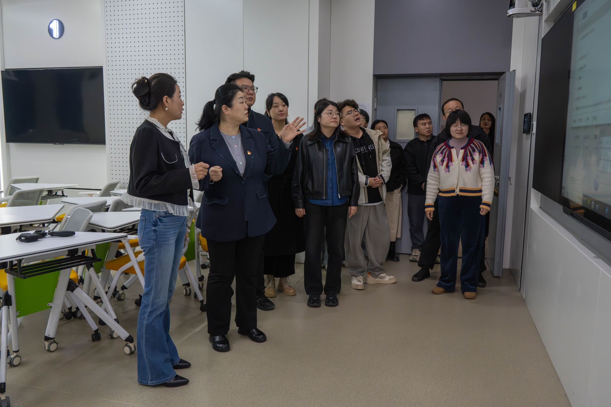 活动伊始,全体党员及群众在马院国际党总支组织委员、马克思主义学院副院长赵建英的带领下参观了马克思主义中国化时代化长廊,观看了大学生讲思政课国赛一等奖的获奖作品,参观了思政VR智慧教室,让社区党员及群众代表近距离了解了我校大思政课建设的基本情况。