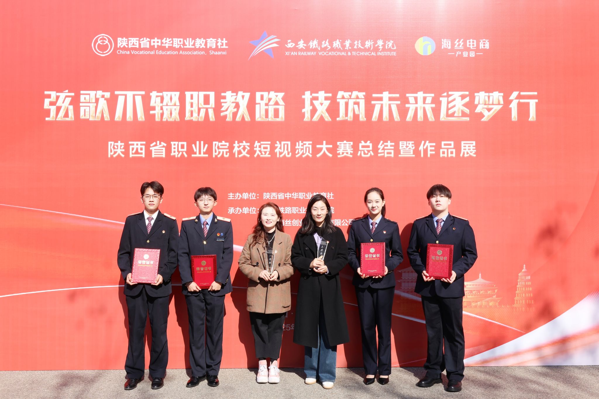 11月20日,由陕西省教育厅、陕西省人力资源和社会保障厅指导,陕西省中华职业教育社主办的“庆祝陕西省中华职业教育社成立25周年”系列活动短视频大赛圆满落幕。西安铁路职业技术学院马克思主义学院高瑞佳、何苗、赵楠三位教师指导,学生侯源政、李泽佳、苏媛、许马乐、朱家坤、张文皓共同创作的作品《坚守 奋进 创新——铁路延展三秦情,青年铸就强国梦》荣获大赛一等奖,《中国铁路缔造奇迹轨迹 中欧班列共绘辉煌篇章》荣获三等奖。