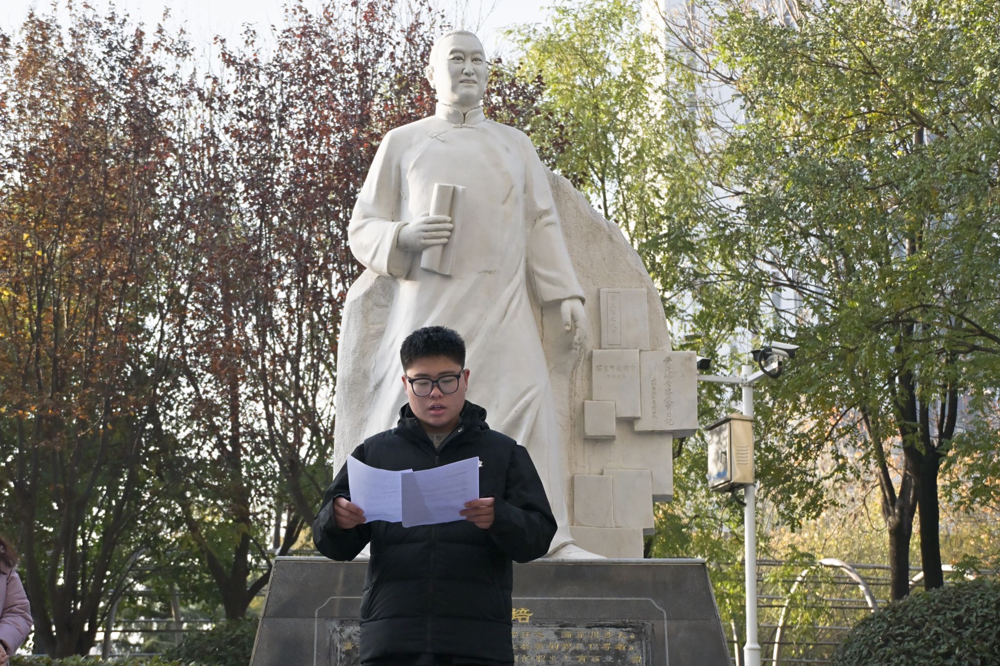 在黄炎培先生雕像前,同学们讲述了一段关于教育救国与实业报国的生动故事。不仅感受到先贤炽热的家国情怀,更深刻体会到教育的力量与知识分子的担当,深刻理解了黄炎培先生一生倡导“手脑并用、做学合一”,致力于打破传统教育桎梏,开创了与中国实际相结合的职业教育之路。他在民族危难之际奔走呼吁,将个人理想融入国家需要,其“理必求真,事必求是”的言行风范,深深感染了在场学子。