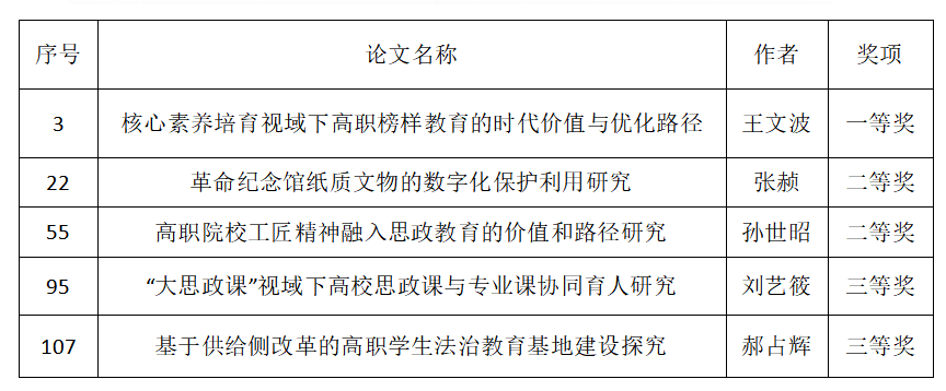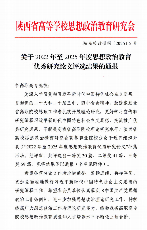 在陕西省高等学校思想政治教育研究会发布的《关于2022年至2025年度思想政治教育优秀研究论文评选结果的通报》(陕高校政研函〔2025〕5号)中,学院共有5名教师获奖,其中一等奖1项、二等奖2项、三等奖2项,成绩优异。