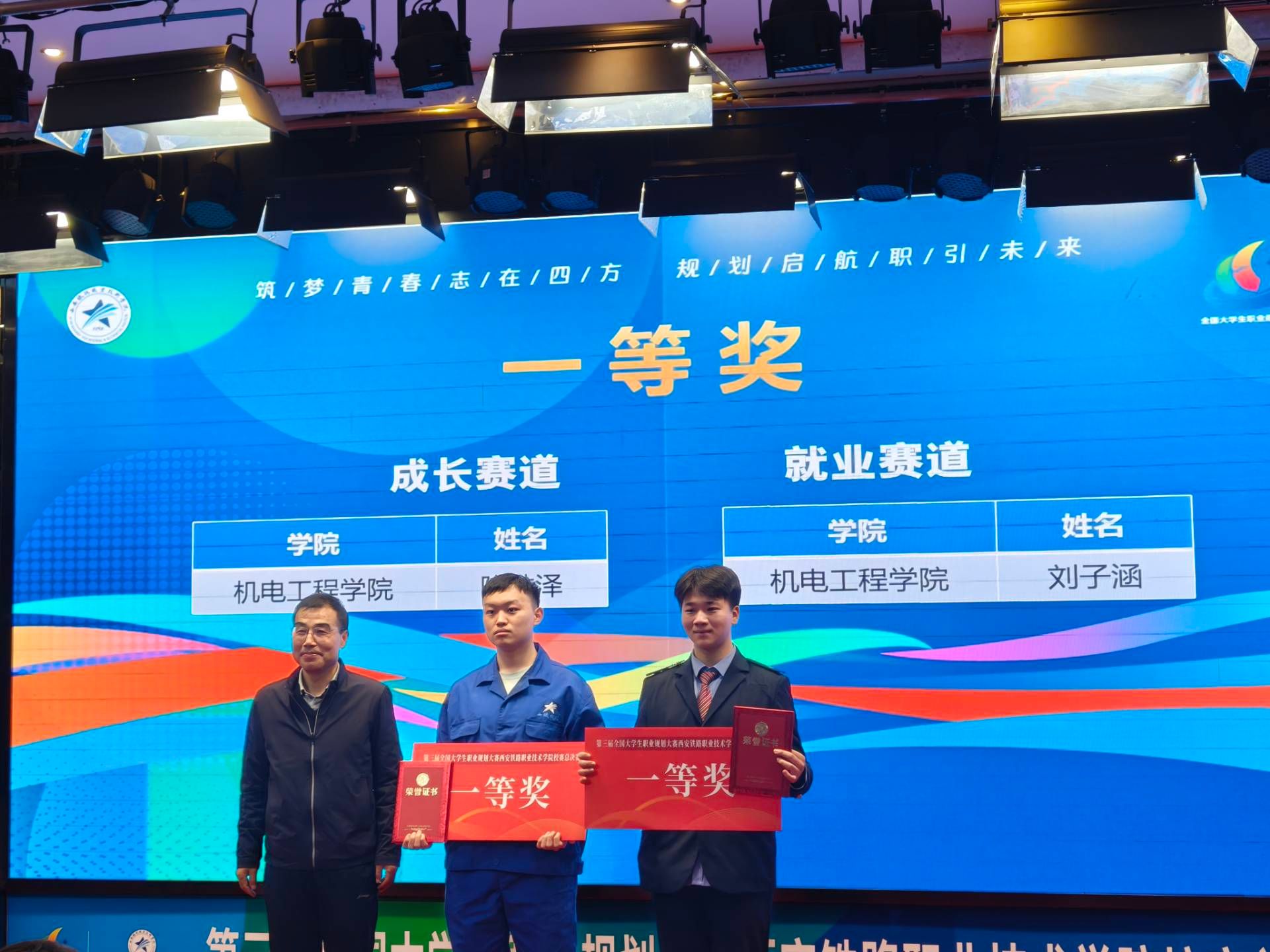 为贯彻落实党中央、国务院关于高校毕业生就业工作的决策部署,强化生涯教育与就业指导,引导学生树立正确职业观、就业观和成才观,西安铁路职业技术学院于2025年12月24日举办第三届全国大学生职业规划大赛校赛总决赛,机电工程学院选送的陈林泽、刘子涵两名学生,在成长赛道和就业赛道中均获得一等奖,学院获优秀组织奖。