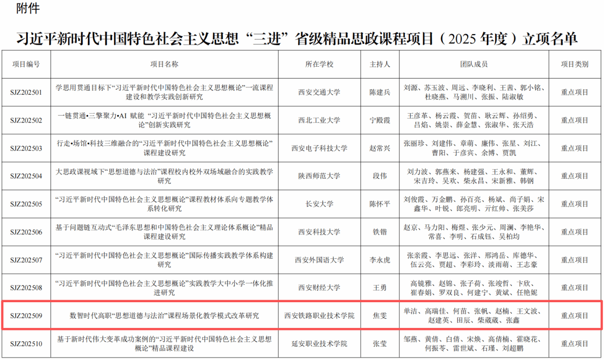 1月14日,中共陕西省委教育工作委员会公布了习近平新时代中国特色社会主义思想“三进”省级精品思政课程项目立项名单。我校马克思主义学院焦雯团队牵头申报的《数智时代高职“思想道德与法治”课程场景化教学模式改革研究》项目成功立项省级精品思政课程重点项目,全省共立项重点项目10项、一般项目30项,我校是入围重点项目立项的两所高职院校之一。这标志着我校在落实立德树人根本任务、深化高校思政课改革创新方面迈出了坚实一步。