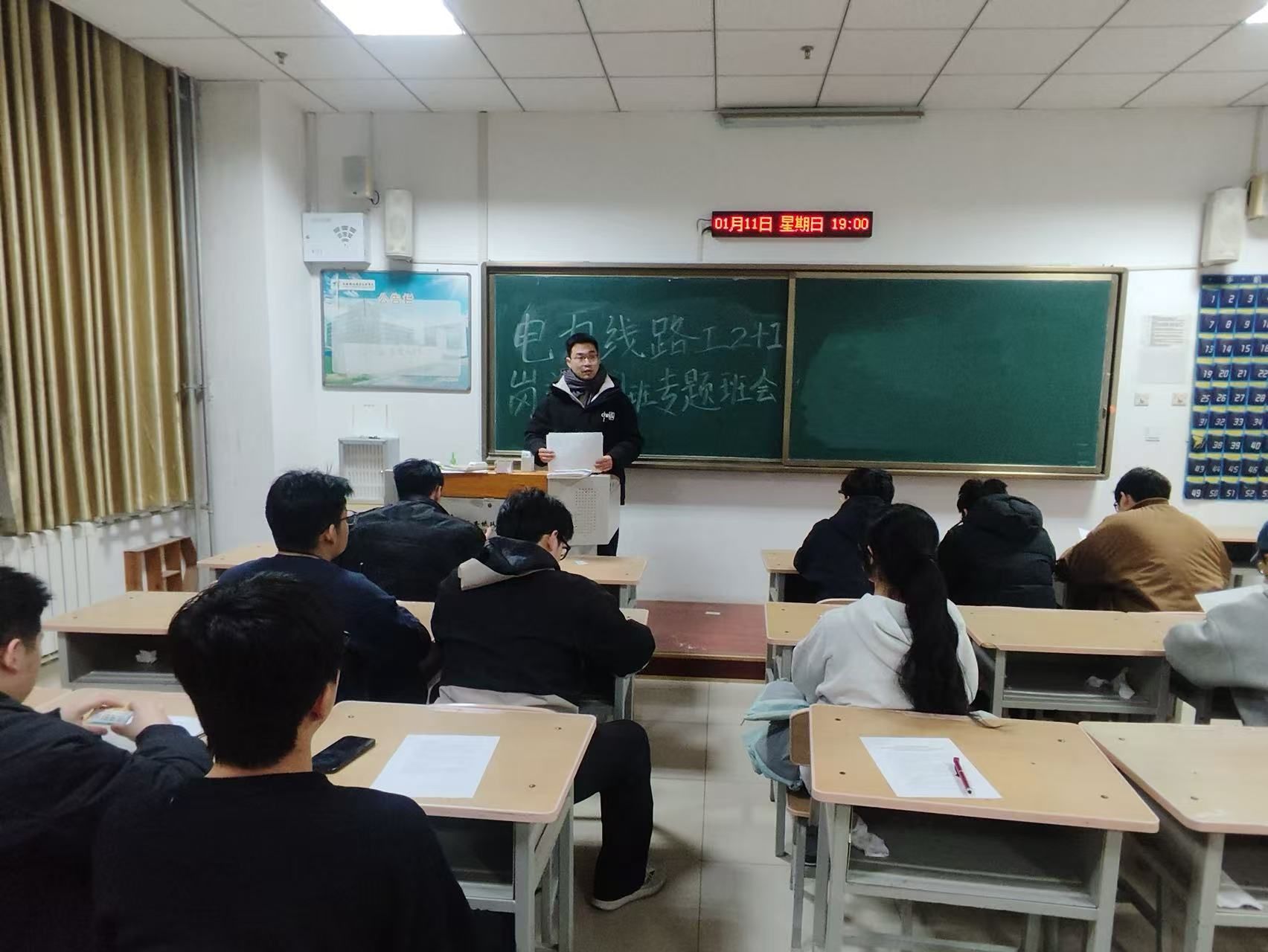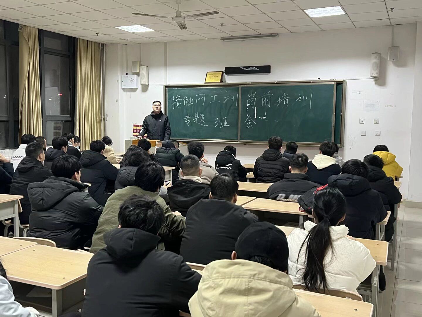 为落实西安铁路职业技术学院关于2026届西安铁路局“2+1”岗前培训学生日常管理的通知要求,帮助学员明晰培训规范、树立正确学习态度、强化安全责任意识,接触网工班与电力线路工培训班分别组织召开专题会议;其中电力线路工培训班动员会于1月11日晚7点在电气楼501教室召开,由辅导员潘海天和牛秦老师主持,全班13名学员悉数参会,接触网工班全体学员参与本班专题学习。