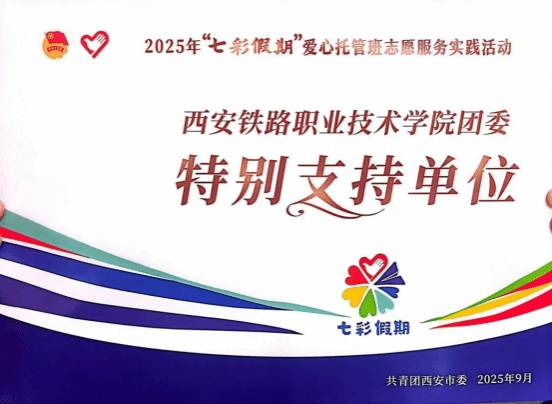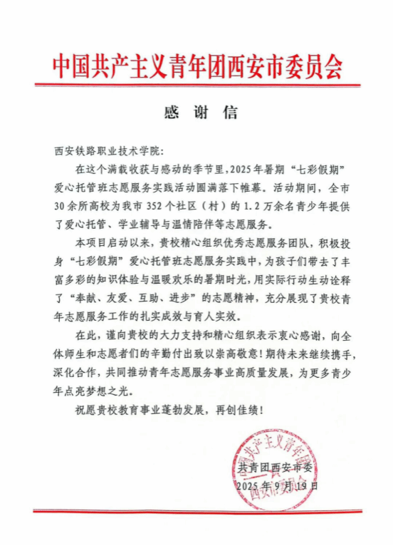 近日,我院团委在西安市2025年暑期“七彩假期”爱心托管班志愿服务实践活动中被团市委授予“特别支持单位”荣誉称号,同时团市委发来感谢信,对我院共青团组织动员青年投身“七彩假期”爱心托管班志愿服务工作给予高度肯定。